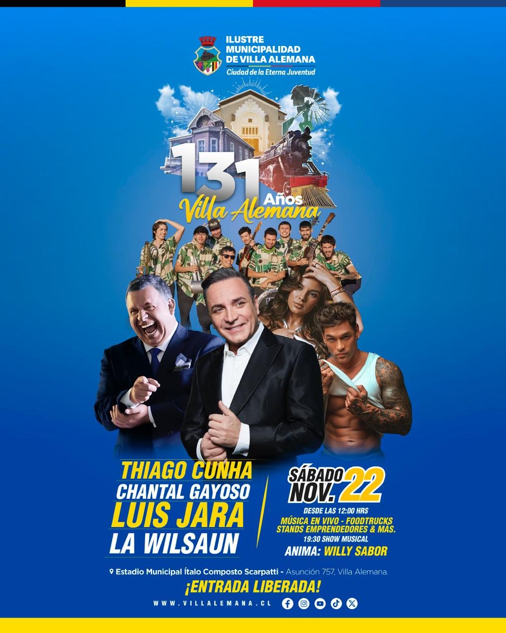 “Hemos preparado con mucho cariño una programación para celebrar juntos este nuevo aniversario de Villa Alemana. Hicimos un gran esfuerzo para traer artistas de nivel internacional como Luis Jara; pero también queremos relevar el gran talento local de bandas como La Wilsaun; traer baile y alegría brasileña con Tiago y Chantal; y la simpatía, carisma y buena onda de un gran comunicador como Willy Sabor, y así ofrecer un espectáculo completo, gratuito y de calidad para todas las familias de la comuna. Los esperamos este sábado 22 de noviembre en el Estadio Ítalo Composto, celebremos juntos los 131 años de Villa Alemana”.