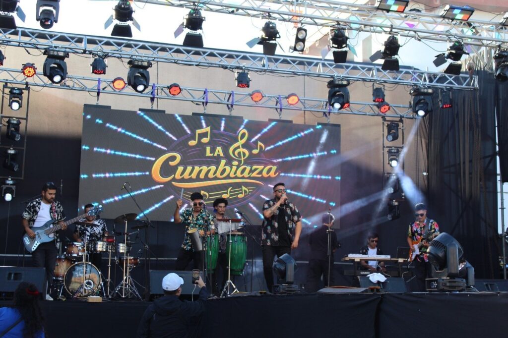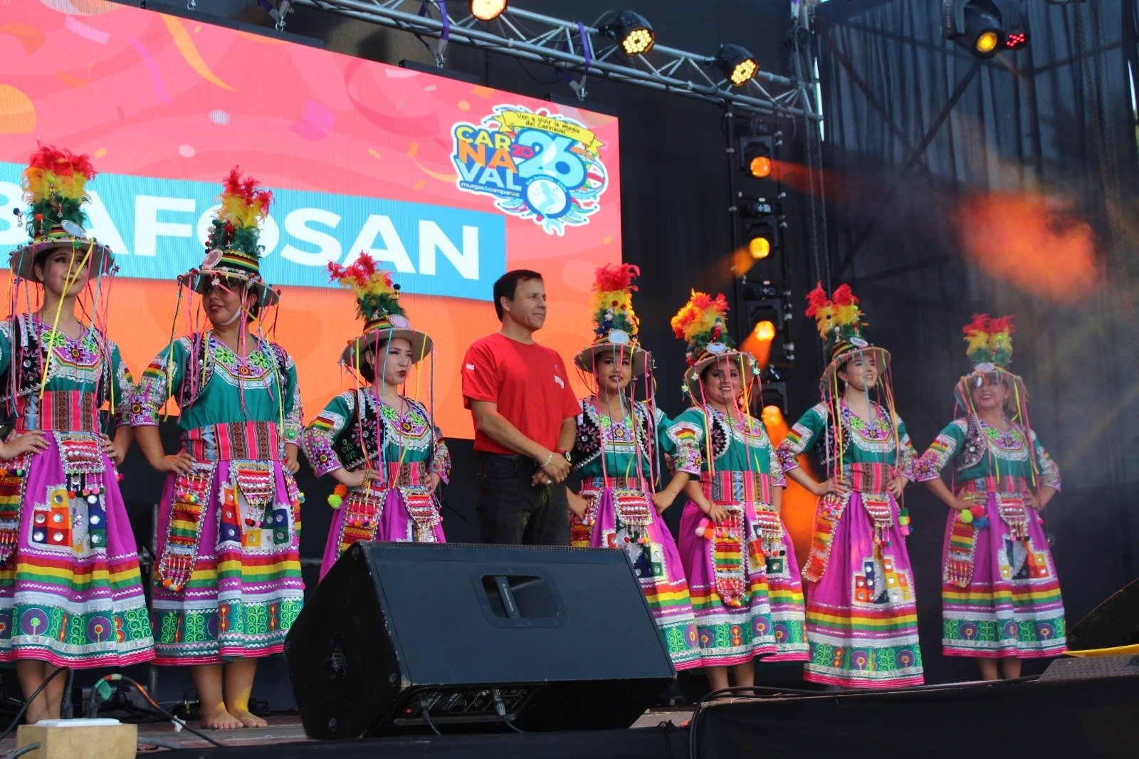 La tarde comenzó con la energía de La Cumbiaza, encargada de encender los primeros movimientos entre familias, jóvenes y vecinos que llegaron desde temprano para acomodarse frente al escenario. El ambiente se transformó rápidamente en una celebración colectiva. El relevo artístico llegó con la presentación del Ballet Folclórico de San Antonio (BAFOSAN), que abrió oficialmente el espectáculo con una propuesta coreográfica que mezcló tradición, identidad territorial y puesta en escena contemporánea.