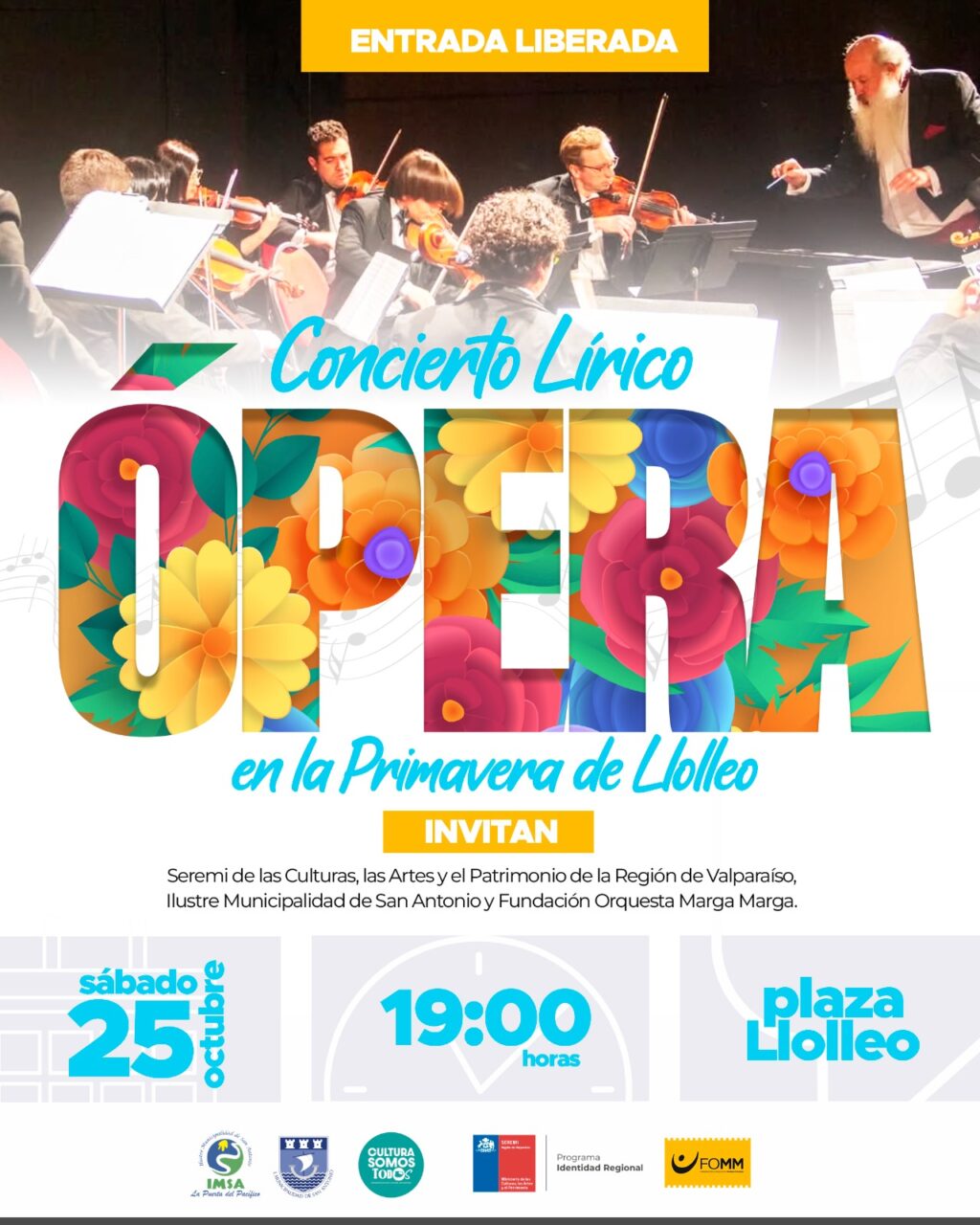 Este sábado 25 de octubre, a las 19:00 horas, la Plaza de Llolleo se convertirá en un escenario de lujo para celebrar el Día Mundial de la Ópera. Bajo el título “Ópera en la Primavera de Llolleo”, el evento reunirá a la Orquesta Marga Marga y tres reconocidos cantantes líricos en un espectáculo gratuito y abierto a toda la comunidad de San Antonio.