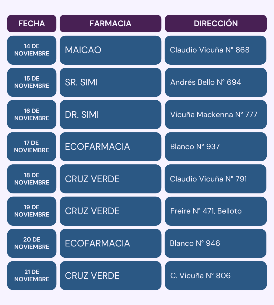 El Periódico Comunal de Quilpué (CQ) pone a disposición de la comuna de Belloto y Quilpué el horario de las farmacias de turno: