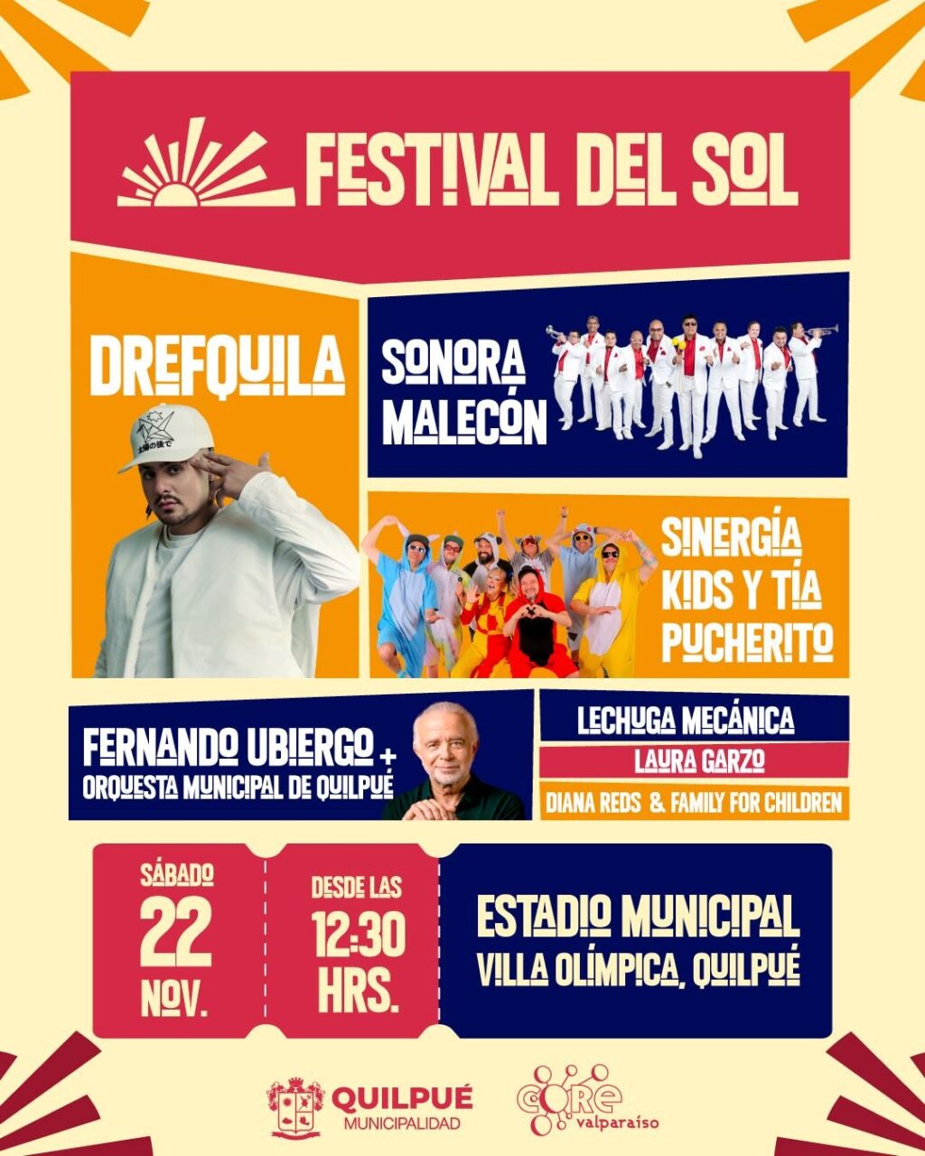 El festival, cuya primera edición se realizó en 1976, vuelve con un formato renovado y con dos escenarios pensados para públicos diversos. En el escenario principal se presentarán figuras de gran trayectoria como el cantautor nacional Fernando Ubiergo, acompañado por la tradicional Orquesta Municipal de Quilpué. También estará el cantante de trap y productor musical DrefQuila, junto al ritmo contagioso de la Sonora Malecón, que traerá todo el sabor de la cumbia.