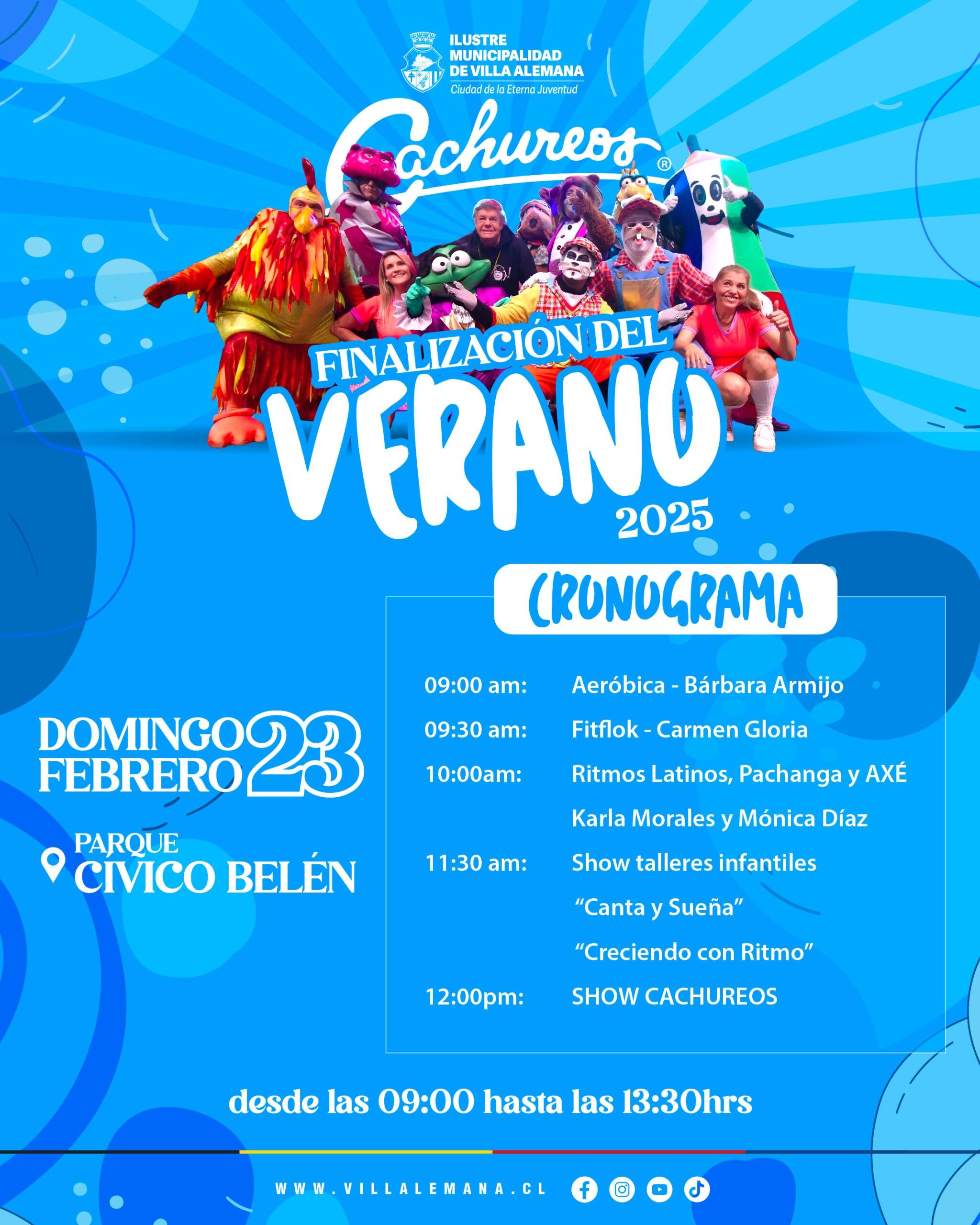El broche de oro de la jornada lo pondrá el esperado espectáculo de Cachureos, el icónico programa infantil que ha entretenido a generaciones de chilenos con personajes entrañables como el Gato Juanito, Epidemia y el Señor Lápiz. Este show promete risas, música y una buena dosis de nostalgia para niños y adultos, consolidándose como el gran cierre de la temporada estival en Villa Alemana.