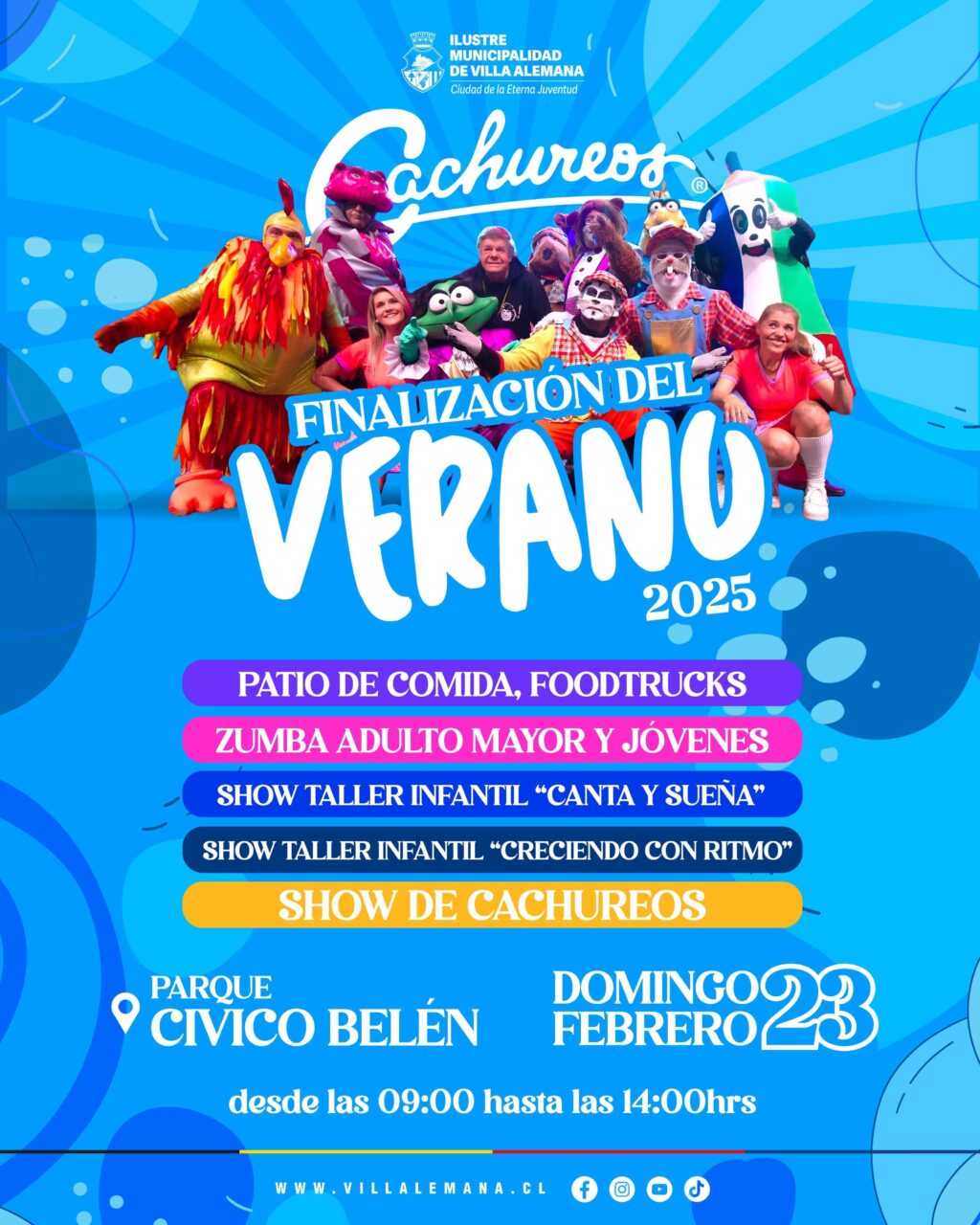 El broche de oro de la jornada lo pondrá el esperado espectáculo de Cachureos, el icónico programa infantil que ha entretenido a generaciones de chilenos con personajes entrañables como el Gato Juanito, Epidemia y el Señor Lápiz. Este show promete risas, música y una buena dosis de nostalgia para niños y adultos, consolidándose como el gran cierre de la temporada estival en Villa Alemana.