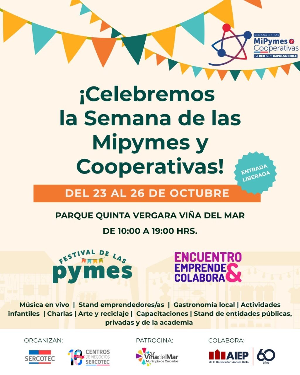 Con el Parque Quinta Vergara como escenario principal, Sercotec da inicio a una nueva edición de la Semana de las MiPymes y Cooperativas, una instancia que se ha consolidado como el mayor encuentro de fomento productivo en la Región de Valparaíso. Este 2025, la celebración se articula en torno a dos eventos emblemáticos: el “Festival de las Pymes” y el “Encuentro Emprende y Colabora”, ambos con entrada liberada y abiertos a toda la comunidad entre el jueves 23 y el domingo 26 de octubre.